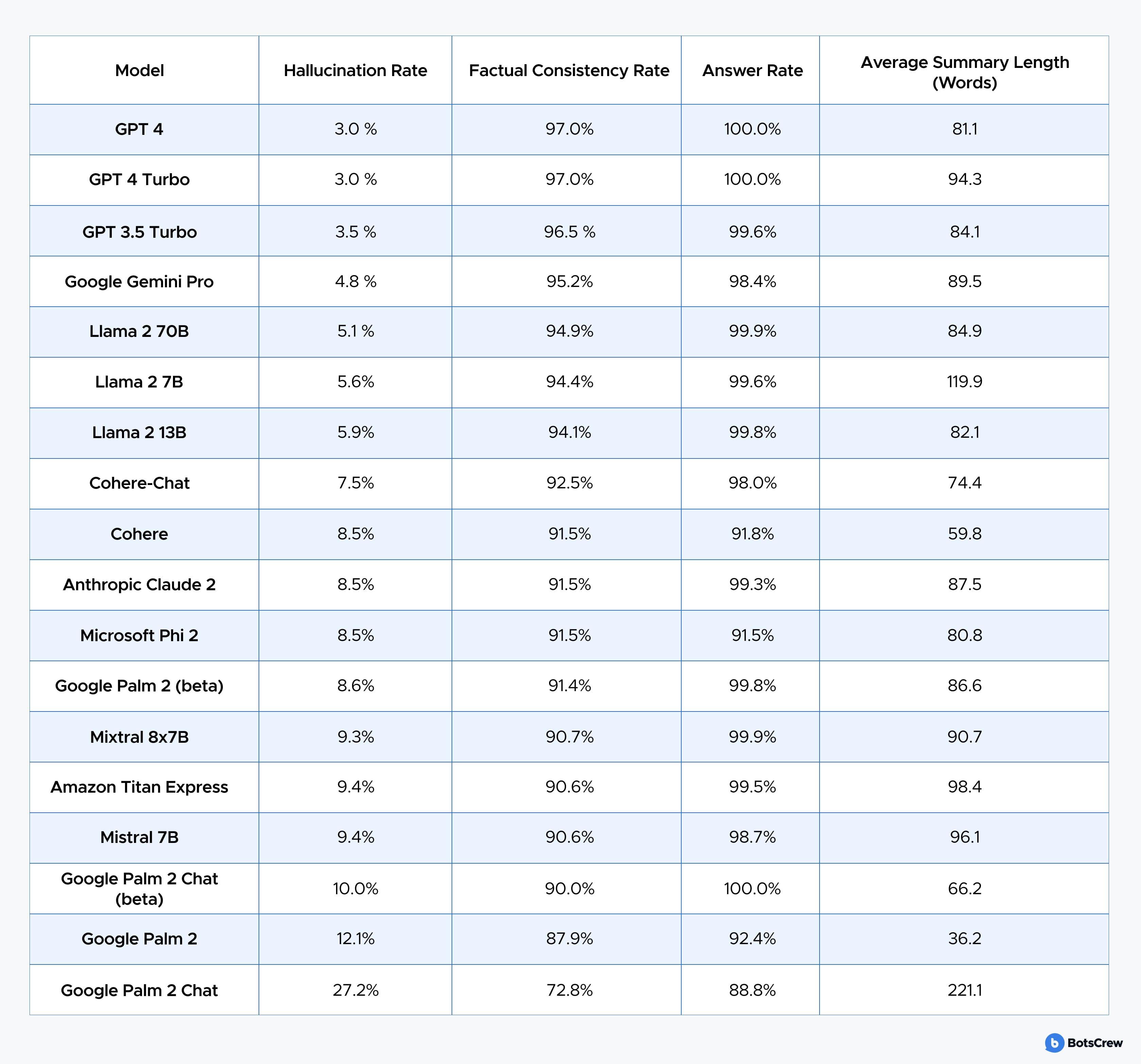 Even Vectara, a startup studying hallucination rates, found major differences across models: GPT-4 and GPT-4 Turbo hallucinated only about 3% of the time in summarization tests, while Google's PALM 2 hit 27%.