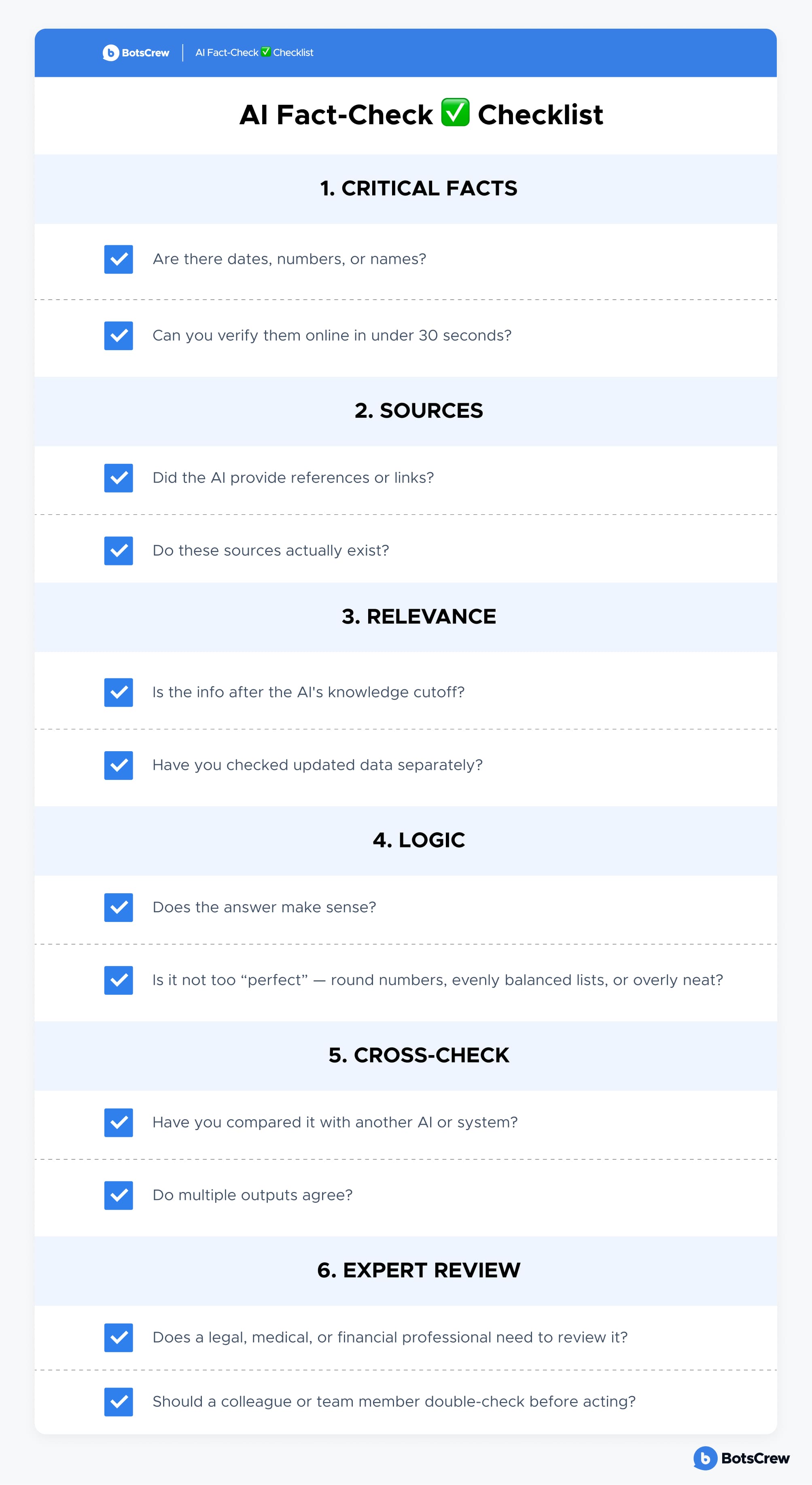 At BotsCrew, we take AI reliability seriously — especially in industries like healthcare, finance, and legal services, where accuracy is critical. Our AI solutions are designed to provide trustworthy, evidence-based answers, reducing errors and building confidence in every interaction.