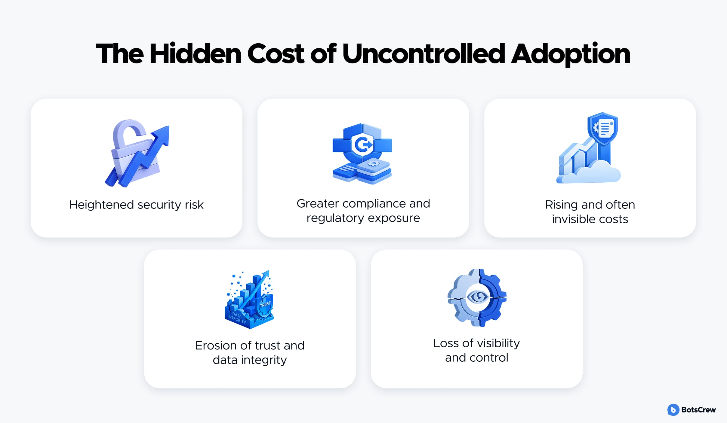 The financial impact extends far beyond duplicate subscriptions. Redundant spending accumulates. Security incidents become more likely. Regulatory exposure increases. Rework and retraining dilute promised efficiency gains. Strategic AI initiatives stall because resources are consumed managing uncontrolled adoption.
