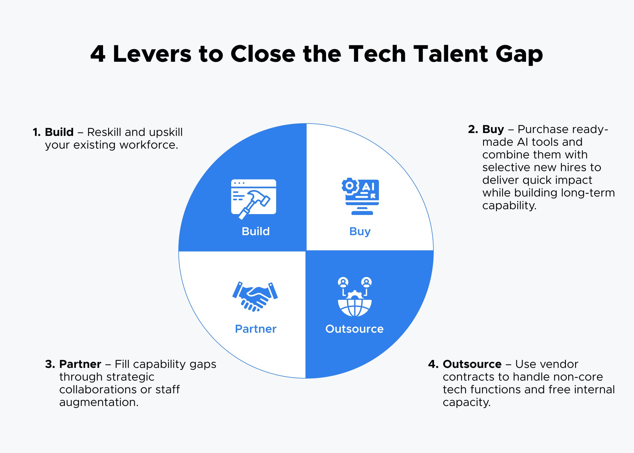 Having examined the root causes behind the AI talent shortage, it's time to focus on what leaders can do about it. For C-level executives, HR and talent acquisition leaders, and technology decision-makers, the challenge goes beyond AI talent acquisition — it is about designing a sustainable approach to building, buying, and bridging AI capabilities across the organization.