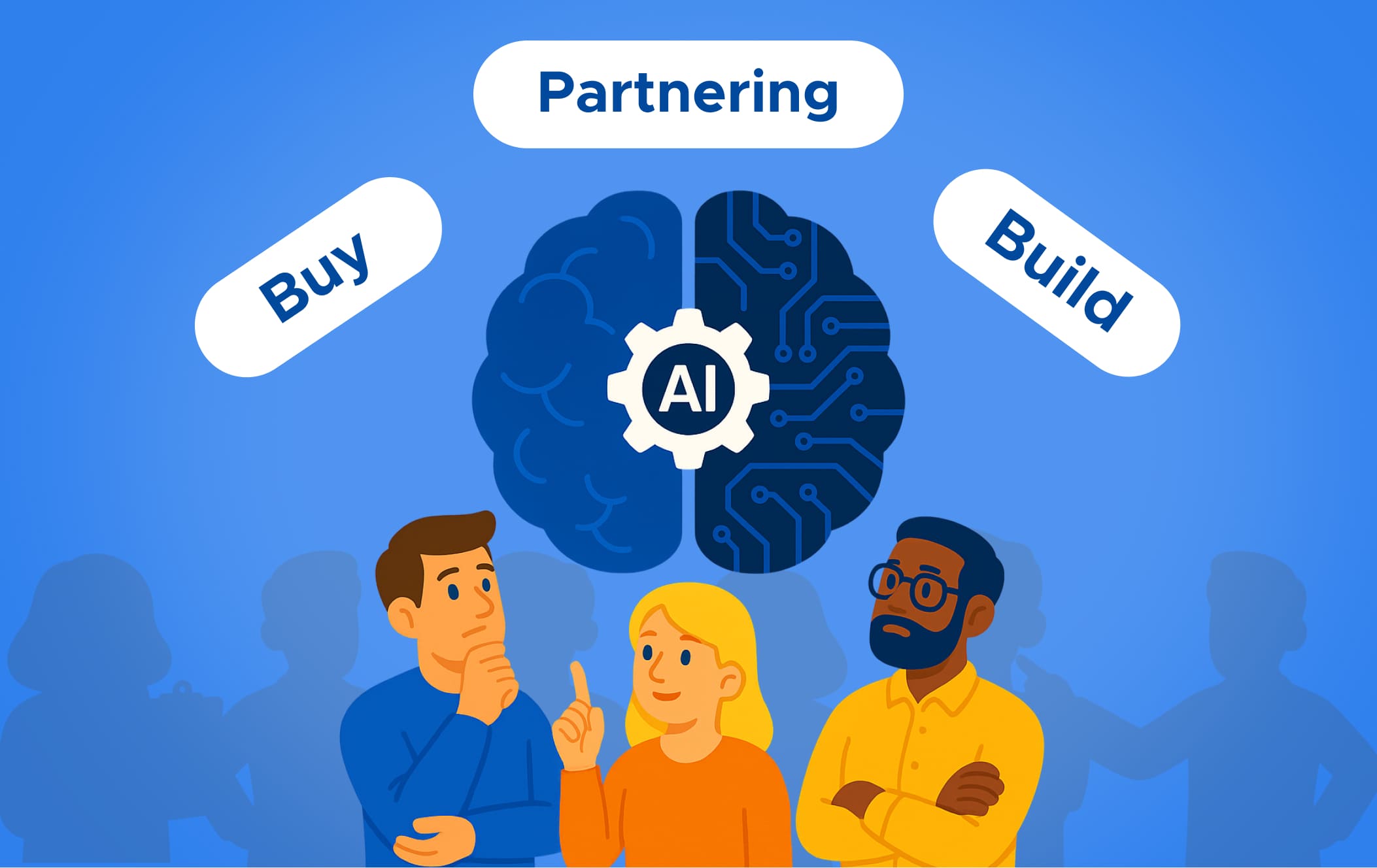 Many leading organizations adopt a buy now, build later approach — purchasing pre-built tools to deliver short-term value while developing an internal AI roadmap in parallel.