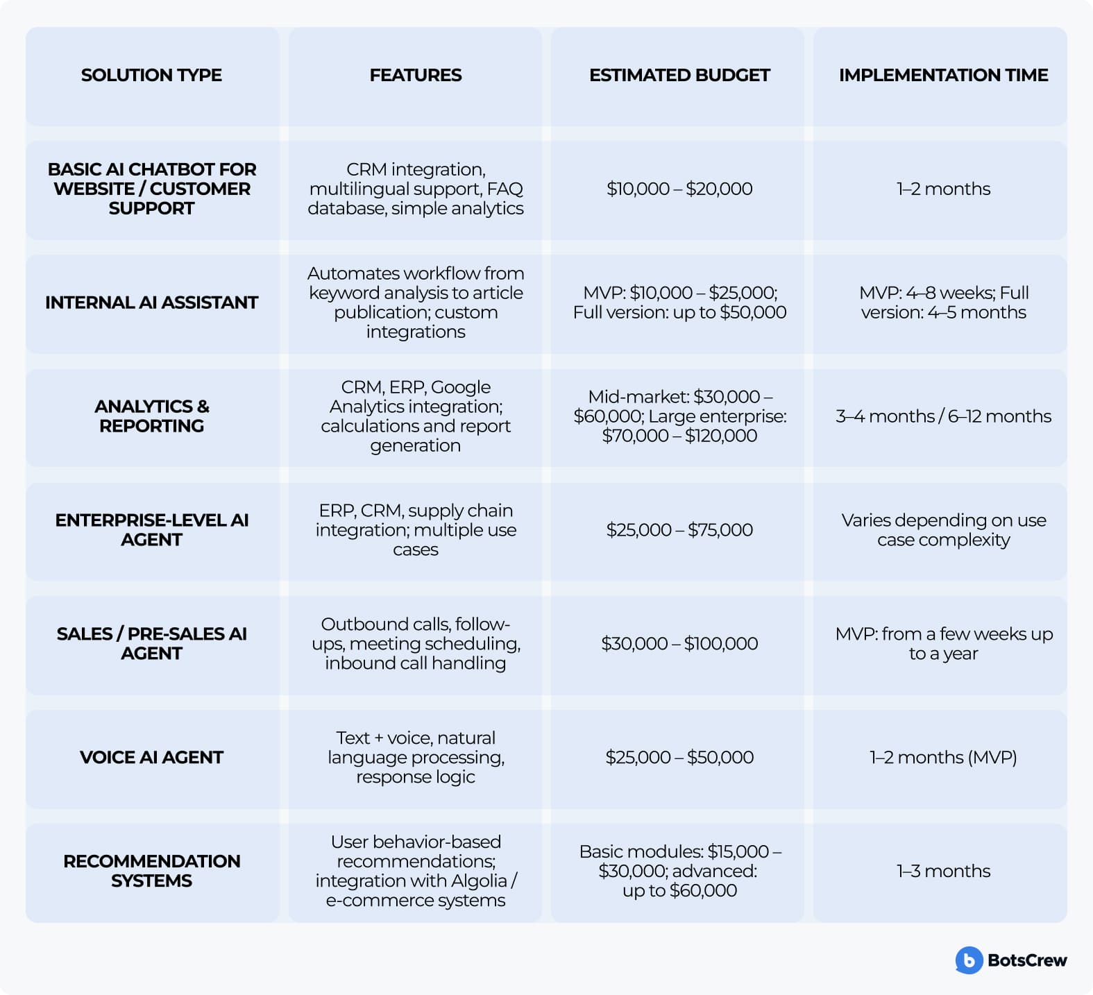 *The examples we've shared are meant to guide expectations — not dictate them. Every custom AI solution is unique, and costs can vary based on complexity and scope. As a general guideline: