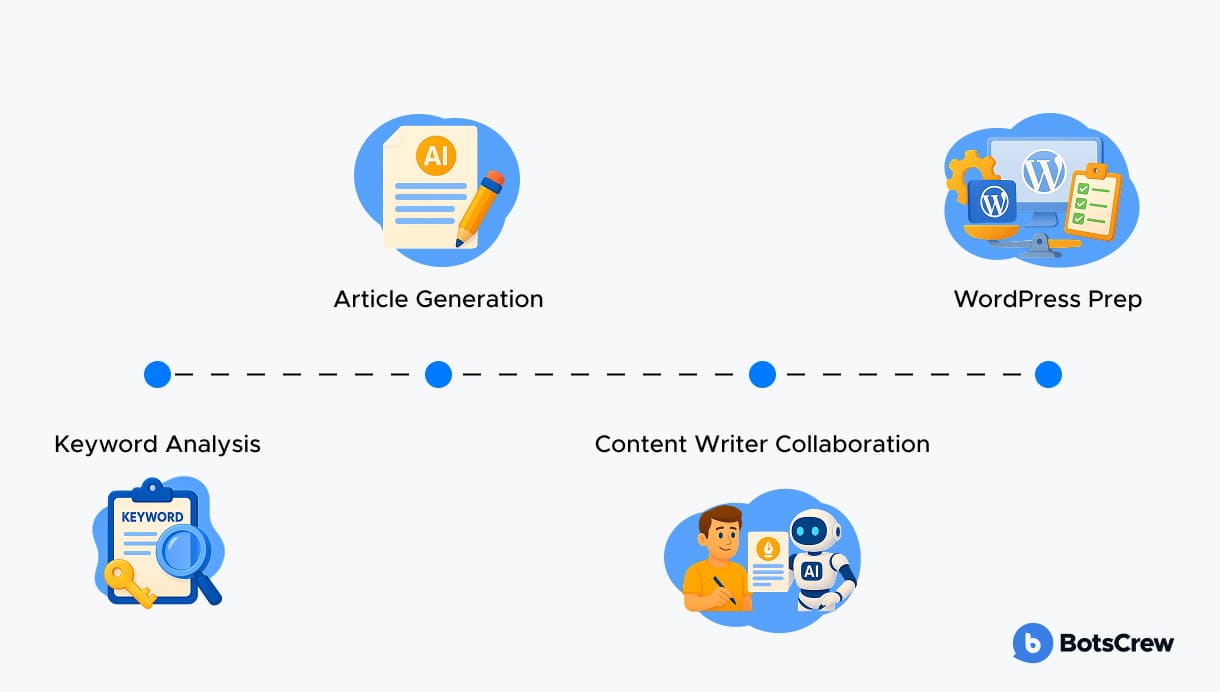 In fact, the system automates the entire content production journey — from the first keyword to the moment you hit “Publish.”